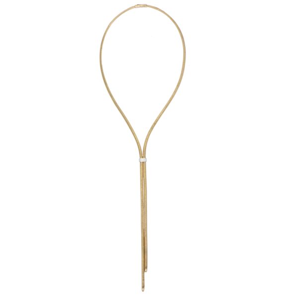 Collar elaborado en oro de 18 quilates (Au 750) con un diseño elegante y sofisticado. Está decorado con 31 diamantes blancos con un peso total de 0,15 ct, color GH y claridad SI, que aportan un brillo delicado y atemporal. Con una longitud de 80 cm y un peso estándar de 20 g, este collar combina lujo, confort y estilo, convirtiéndose en una pieza ideal tanto para el uso diario como para ocasiones especiales.
