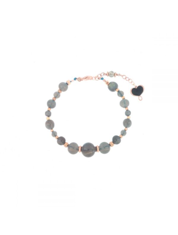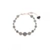 Pulsera de la colección Essential, elaborada en plata 925 con baño de oro rosa de alta resistencia y grosor. Su diseño combina dieciocho piedras de labradorita de diferentes tamaños con delicados cubos de hematita, creando una joya única que refleja matices iridiscentes y una elegancia natural.