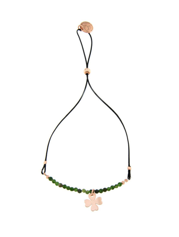 Pulsera de hilo Essencial con colgante de trébol de cuatro hojas de 8 mm y piedras de ágata verde. Elaborada en plata 925 gruesa y resistente con baño de oro rosa, combinada con hilo de nailon negro, ofrece un diseño artesanal elegante y moderno. Su cierre ajustable con cuenta de silicona permite adaptarla cómodamente a cualquier muñeca. Perfecta para lucir sola o combinar con otras pulseras, aportando un toque de estilo, elegancia y buen gusto a tu look diario.