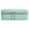 La colección Palermo es encantadora y sofisticada, inspirada en la ciudad italiana que le da nombre, situada junto al mar. Este estuche para joyas con cremallera en azul agua presenta un exterior de cuero suave con refinados herrajes dorados, combinando elegancia y funcionalidad en un accesorio de viaje ideal.
