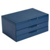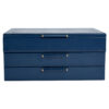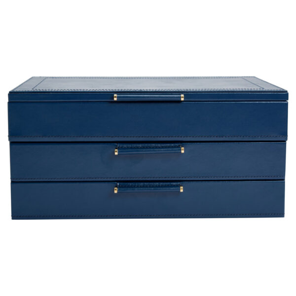 Joyero WOLF Sophia en azul con interior azul claro, que combina lo clásico con lo contemporáneo. Este joyero con cajones es perfecto para mantener sus joyas organizadas de forma práctica y sofisticada. Está revestido en cuero de alta calidad y cuenta con accesorios metálicos dorados que realzan su diseño refinado.