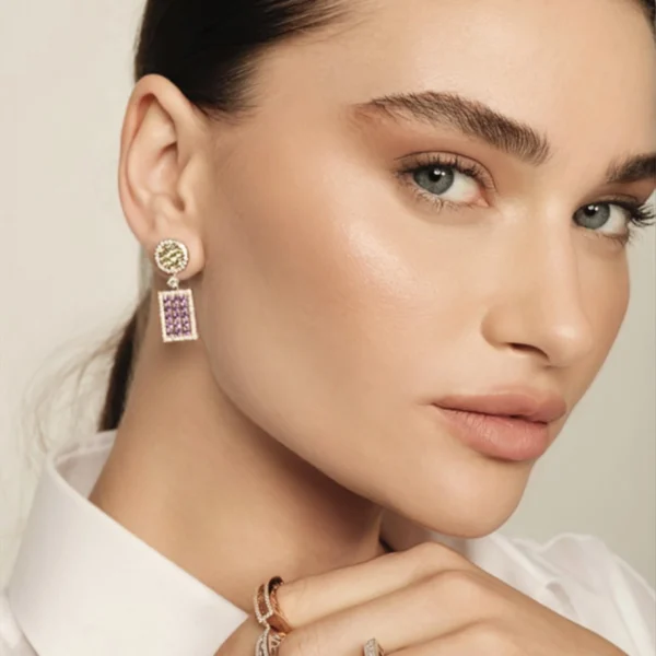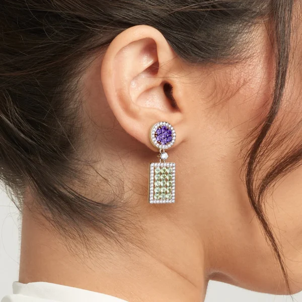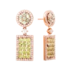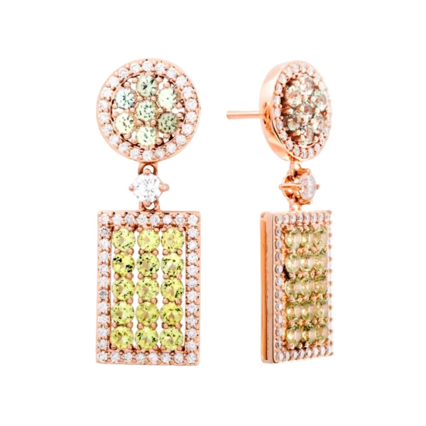 Pendientes de oro rosa de 18 quilates que combinan brillo deslumbrante y elegancia colorida. Engastados con 118 piedras, incluyendo diamantes blancos de color G–H y pureza SI, junto a zafiros y peridotos, reflejan sofisticación y estilo en cada detalle. Su cierre de presión garantiza comodidad y seguridad, convirtiéndolos en una joya espectacular para ocasiones especiales y para realzar cualquier look con distinción.