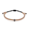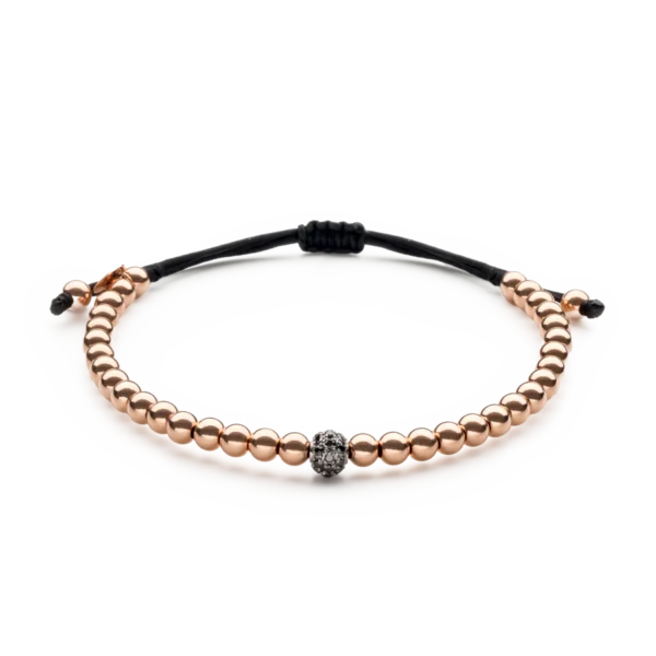 Pulsera elaborada en oro rosa de 18 quilates (aprox. 2,46 g) con un diseño elegante y moderno. Está decorada con 26 piedras, incluyendo una bola pavé de 6 mm con diamantes negros y una bola de 4 mm, que aportan un contraste sofisticado y un brillo único. El cordón de nailon ajustable permite adaptar la pulsera a muñecas de 15 cm a 25 cm, ofreciendo comodidad y versatilidad. Una pieza cuidadosamente elaborada que combina lujo, estilo y funcionalidad, perfecta para uso diario o para añadir un toque distintivo a cualquier look.